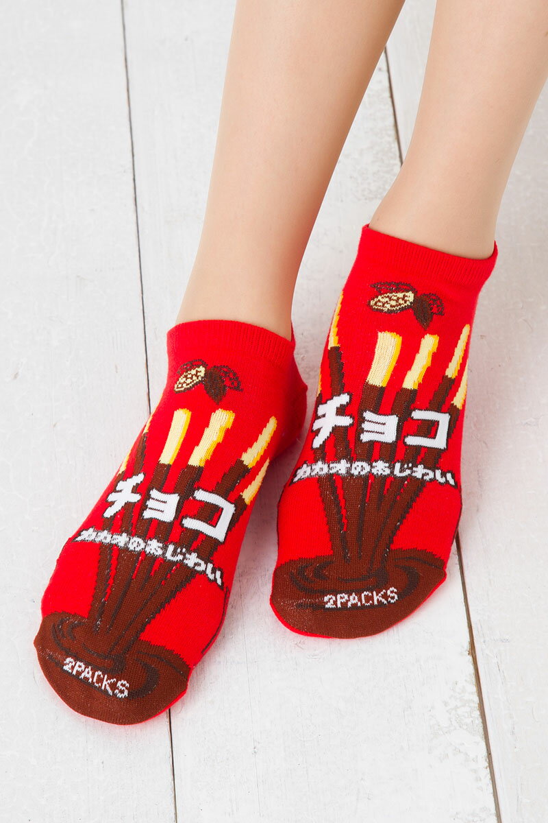 ソックスに書いてある言葉 ◆表面 チョコ カカオのあじわい 2PACKS ◆裏面 名称 チョコレート菓子 材料 カカオ、バター、さとう、はく力粉 10℃以下で保存して下さい。