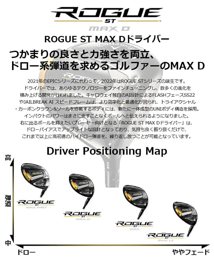 CALLAWAY ROGUE ST MAX D DRIVER キャロウェイ ローグ エスティ マックス デー ドライバー ROGUE ST MAX D DRIVER つかまりの良さと力強さを両立、 ドロー系弾道を求めるゴルファーのMAX D 2021年のEPICシリーズに代わって、2022年はROGUE STシリーズの誕生です。