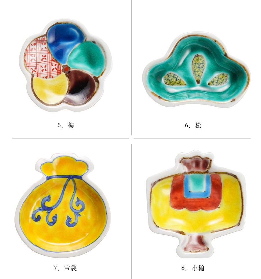 ─┘─┘─┘─┘─┘─┘─┘─┘─┘─┘ 【商品詳細】 ■1.軍配:幅77mm×奥行77mm×高さ10mm 2.鍔型:幅85mm×奥行85mm×高さ10mm 3.彩雲:幅88mm×奥行65mm×高さ10mm 4.亀甲:幅86mm×奥行79mm×高さ10mm 5.梅:幅83mm×奥行83mm×高さ10mm 6.松:幅83mm×奥行56mm×高さ15mm 7.宝袋:幅74mm×奥行82mm×高さ15mm 8.小槌:幅70mm×奥行75mm×高さ10mm ■磁器 ■特徴: ・食洗機対応:○ ・電子レンジ対応:○ ・オーブン対応:× ・直火対応:× ■日本製 ※在庫について この商品は当店別店舗でも販売しております。