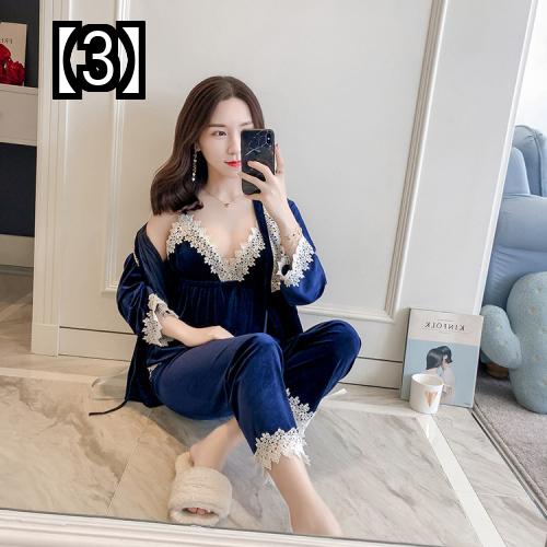 ベロア パジャマ レディース セクシー 長袖 前開き 上下セット 秋冬 厚手 スリーピース 新作 かわいい レース 暖かい ナイトガウン ピンク 青 赤