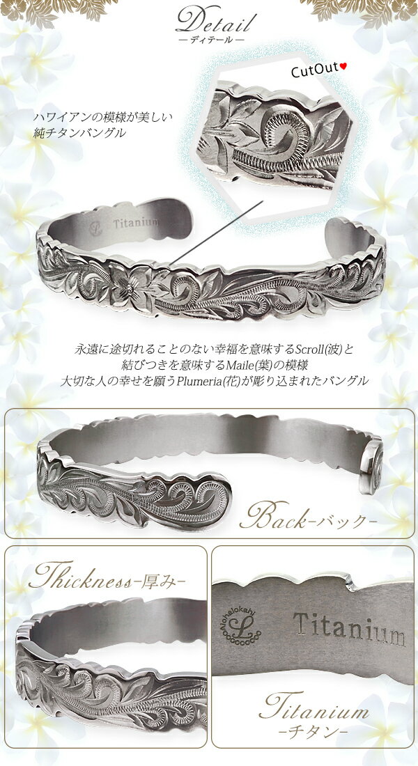 商品説明 商品番号 HBA1H-002-TN10 商品名 ハワイアンジュエリー ハワイアン バングル チタン 刻印無料 プルメリア スクロール サイズ Sサイズ内径55mm、幅10mmMサイズ内径60mm、幅10mmチタンはとても固い素材ですが力を入れていただくと微調整できます。