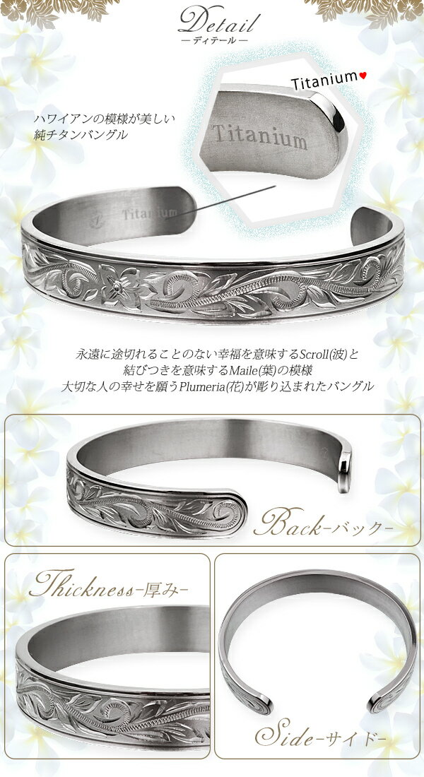 商品説明 商品番号 HBA1H-003-TN10 商品名 ハワイアンジュエリー ハワイアン バングル チタン 刻印無料 プルメリア スクロール サイズ Sサイズ内径55mm、幅10mmMサイズ内径60mm、幅10mmチタンはとても固い素材ですが力を入れていただくと微調整できます。